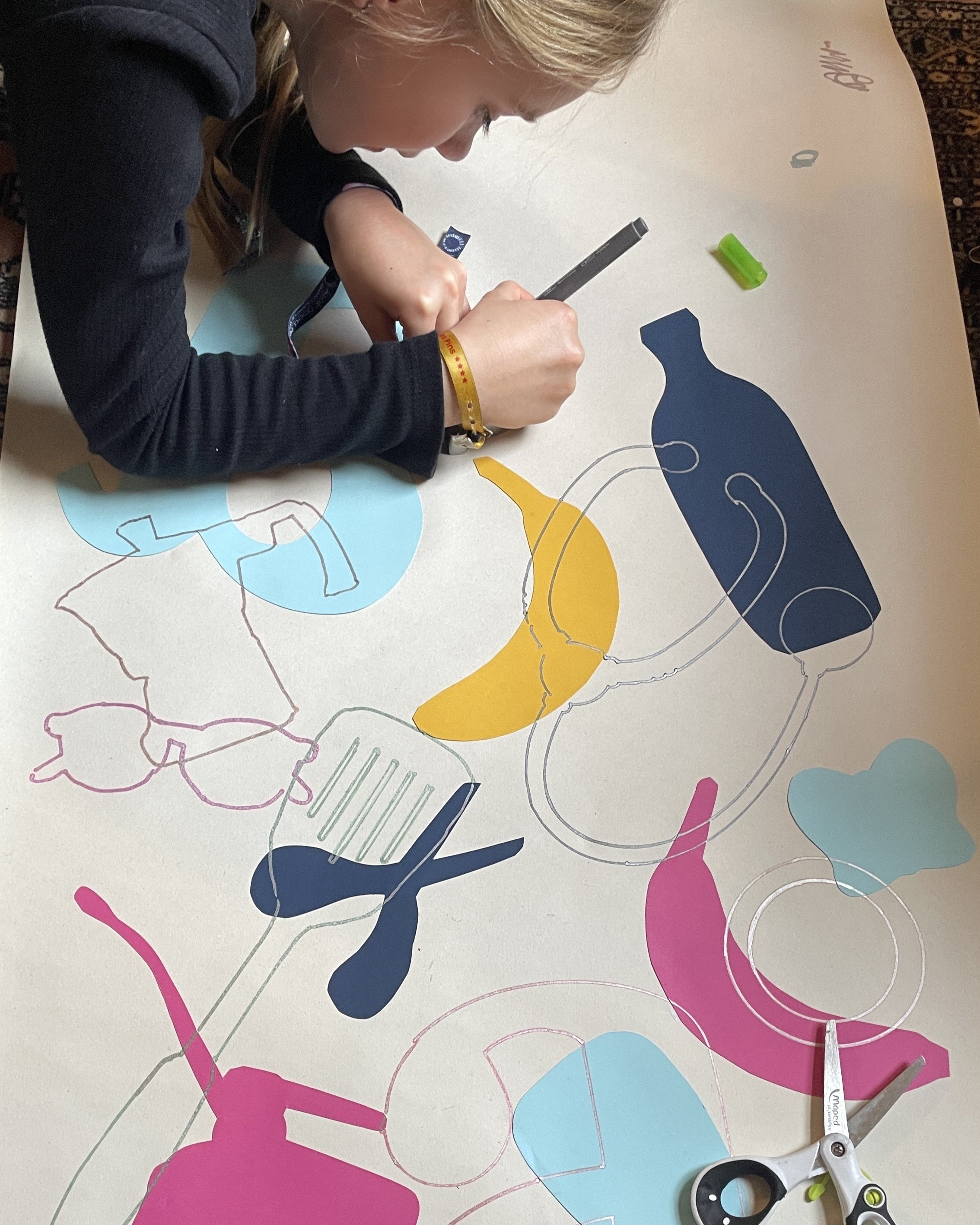 Method: Trace objects onto card, cut them out, glue them to paper, and outline with pens to create layered designs.