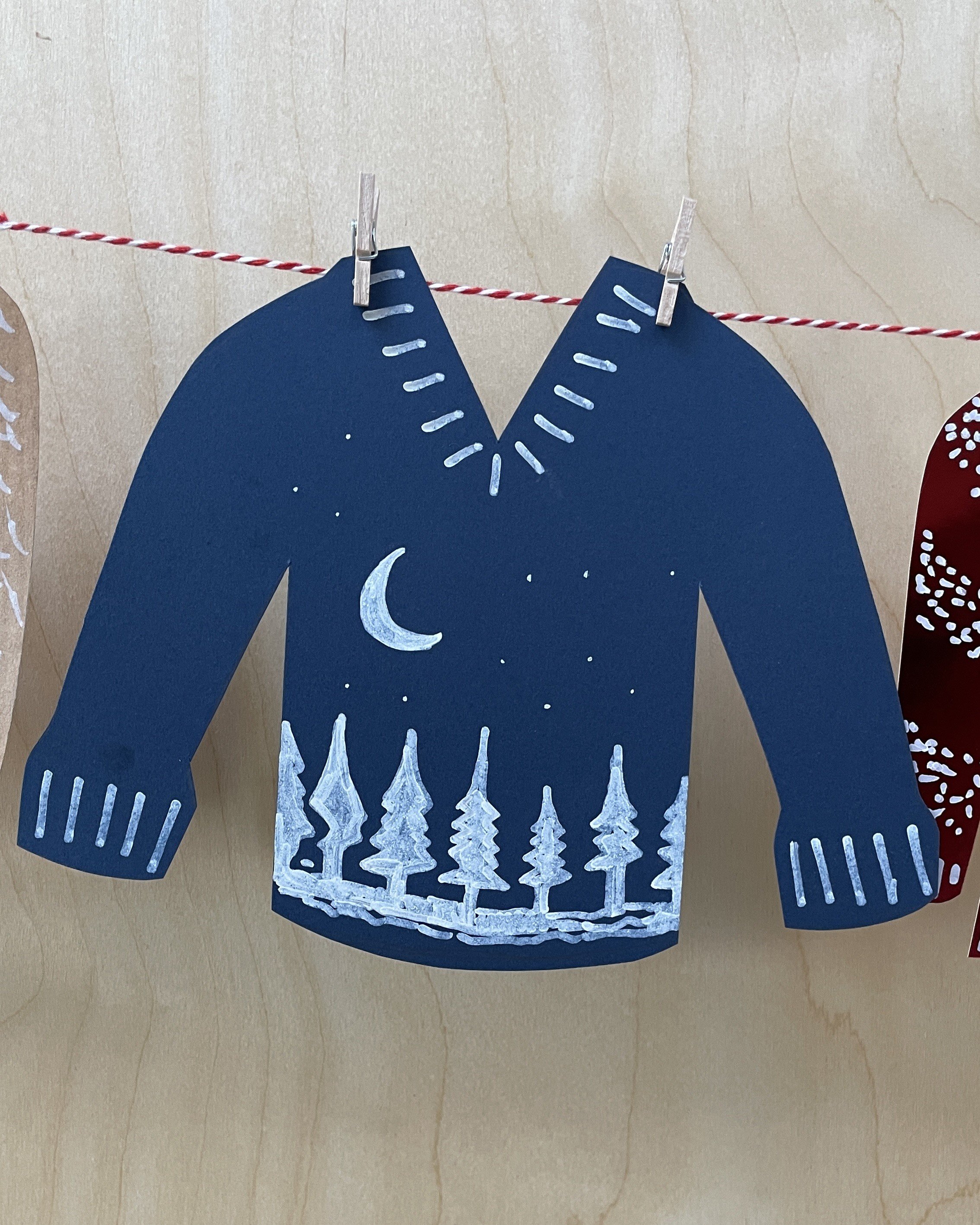 Method: Draw jumper templates, cut out shapes, decorate with festive designs, and peg them to a string line.