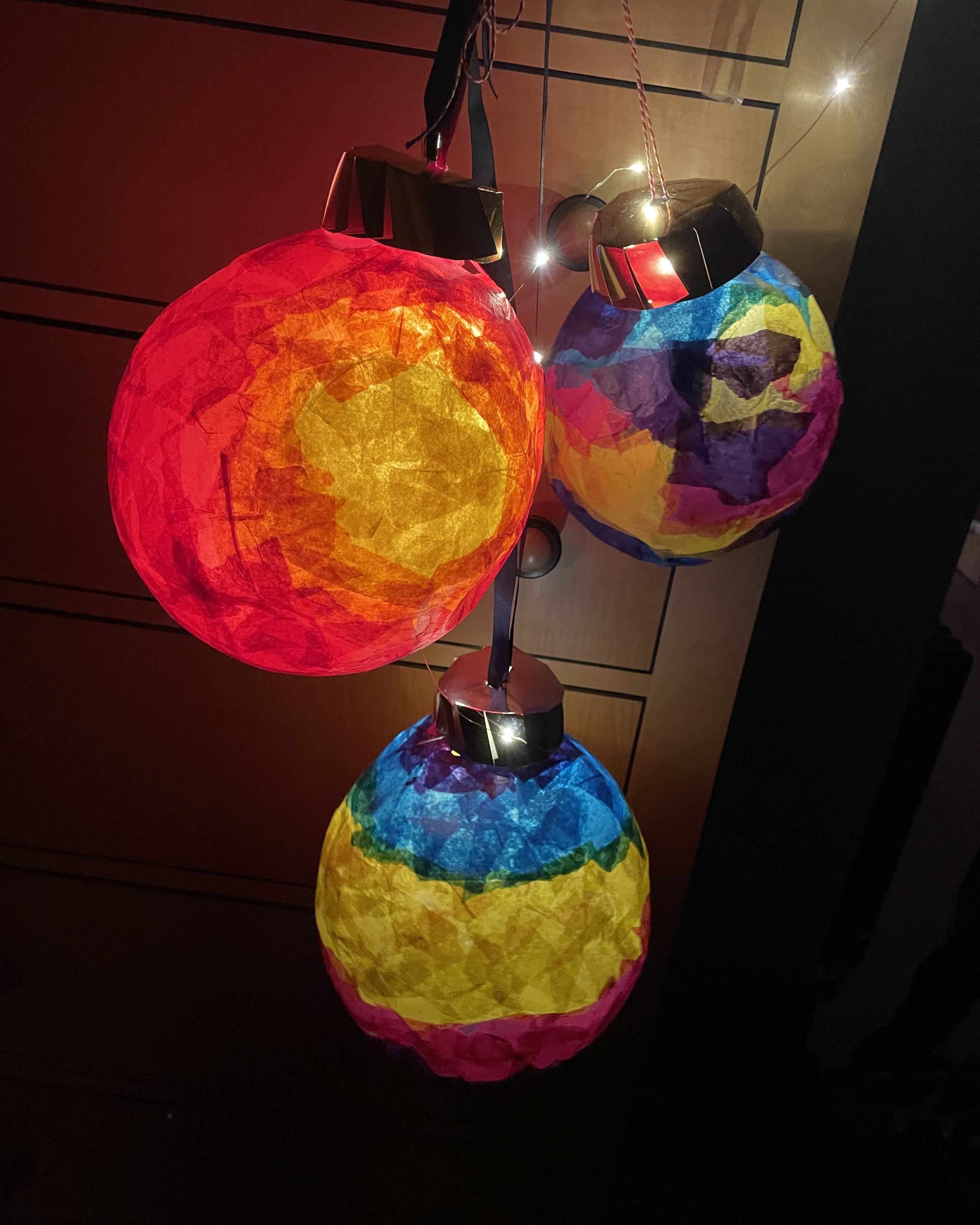 Create oversized Christmas baubles using balloons and tissue paper. Add fairy lights inside for a magical glow.
