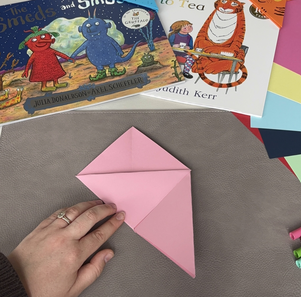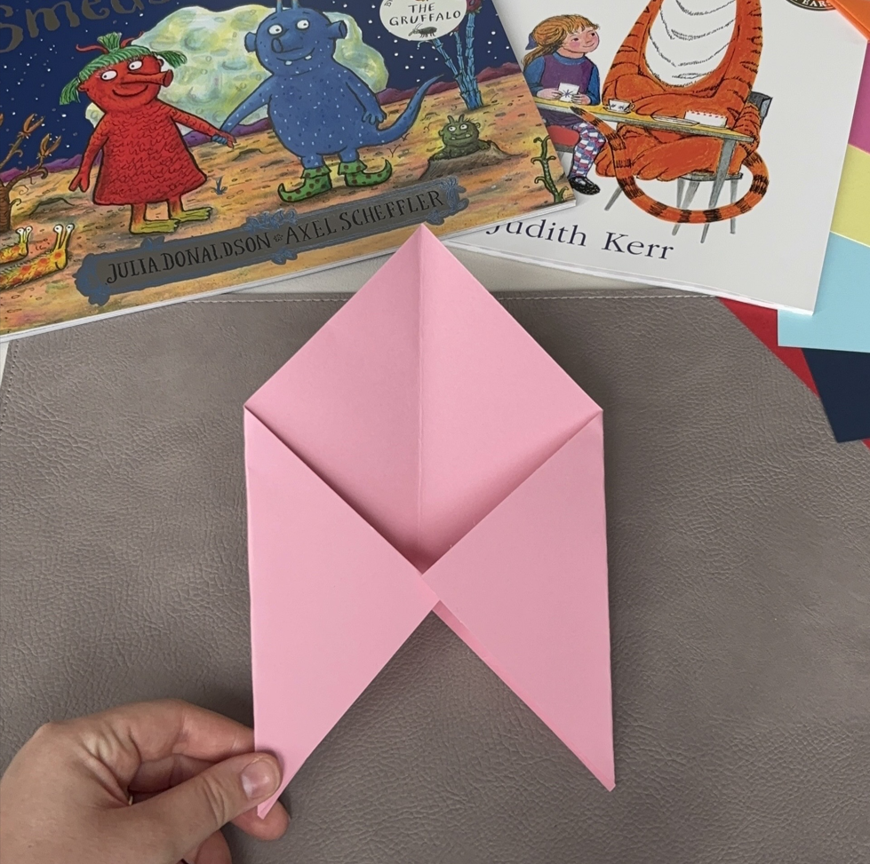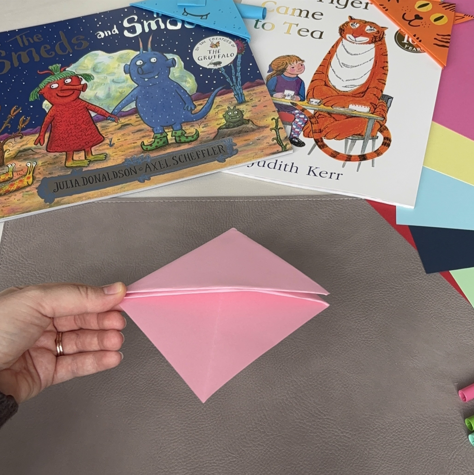 This forms a diamond shape with a little pocket that is perfect for slipping over the corner of a book page.