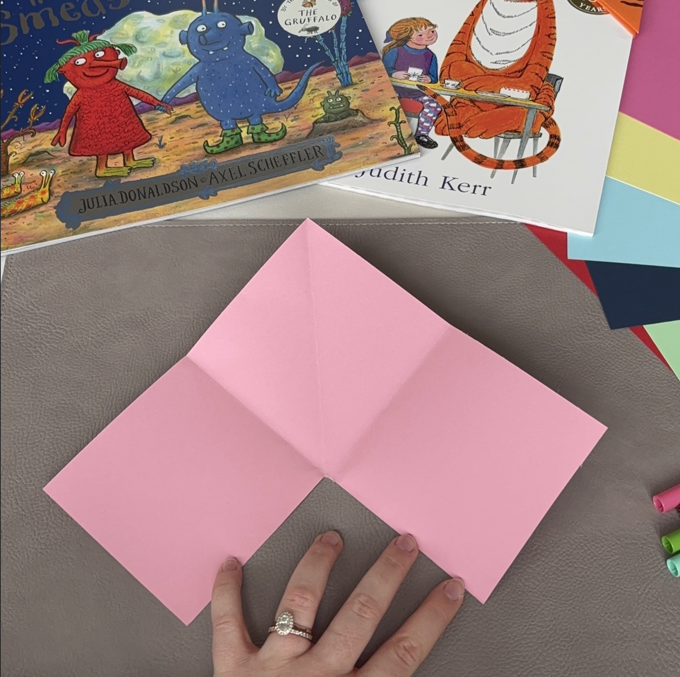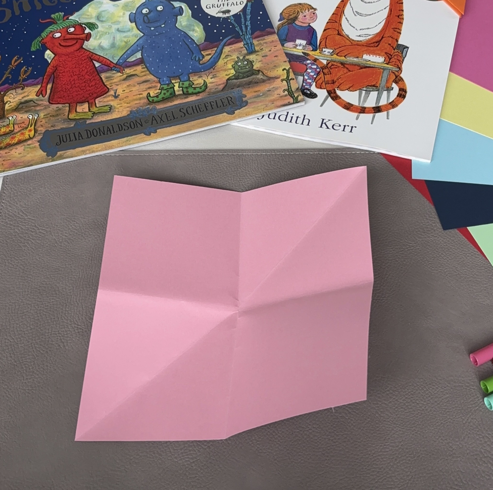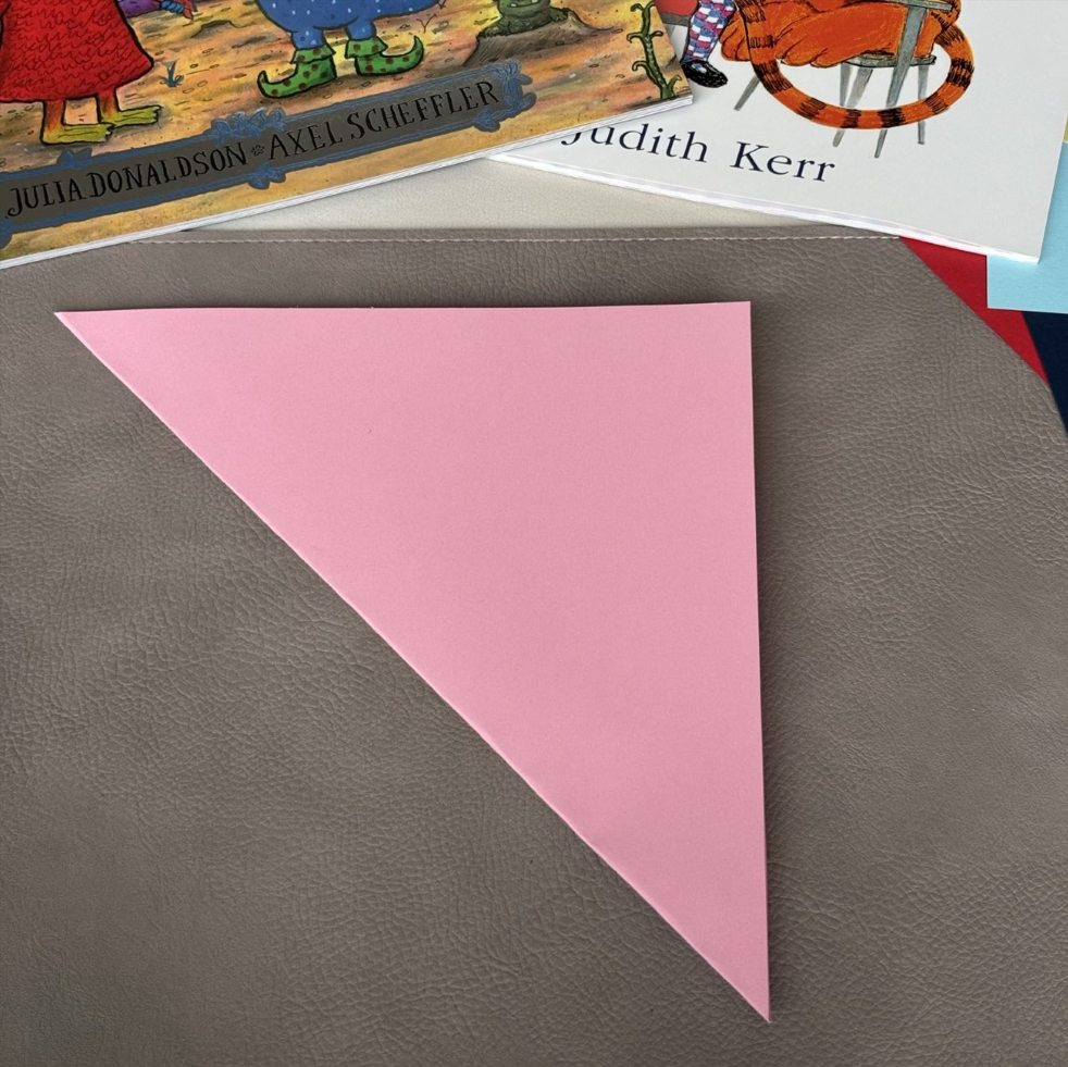 Choose a coloured piece of card based on your child's favourite character, animal, or creature. Turn the card landscape, then fold the bottom corner up to the top edge to create a triangle. Trim off the excess strip to leave a perfect triangle.
