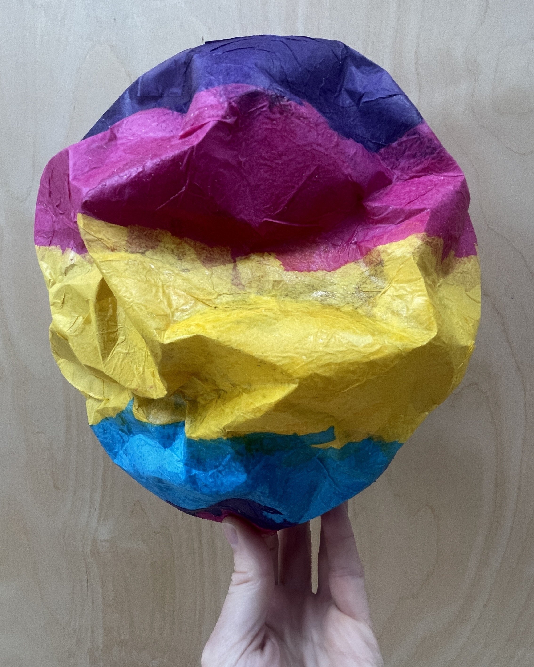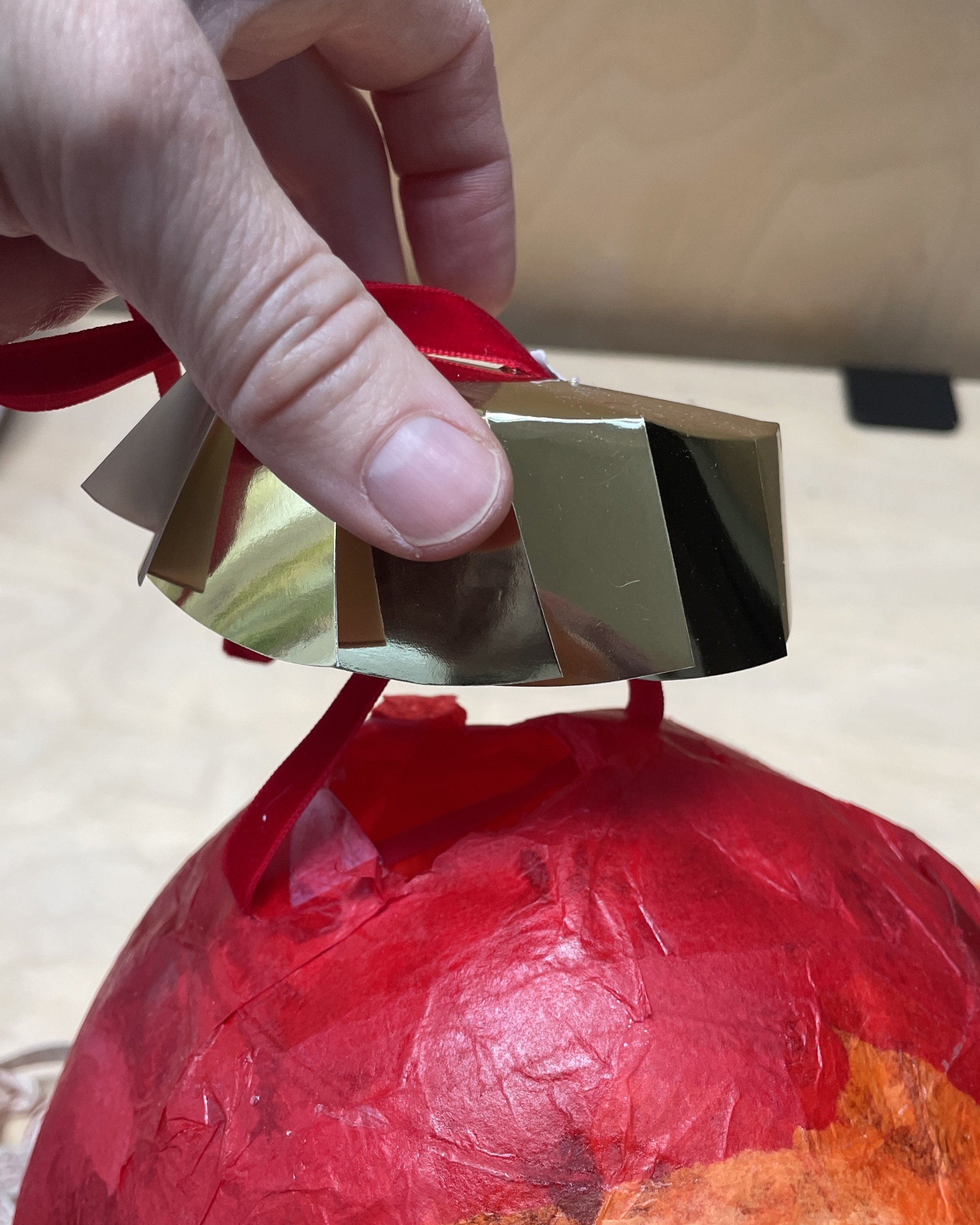 3. Remove the balloon. Pop or cut the balloon. If it shrinks inside, don’t worry — make a small cut, pull it out, and reshape your bauble.