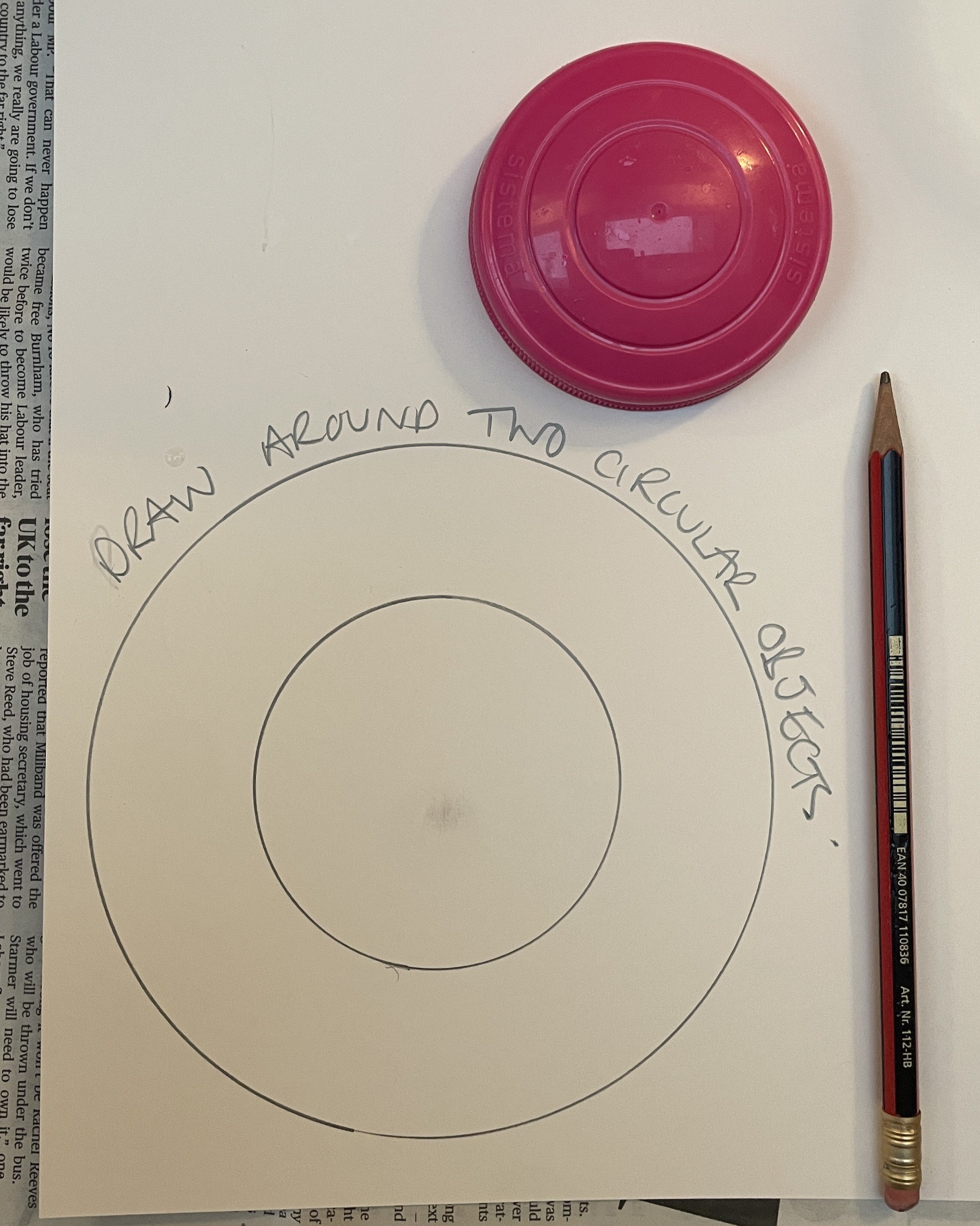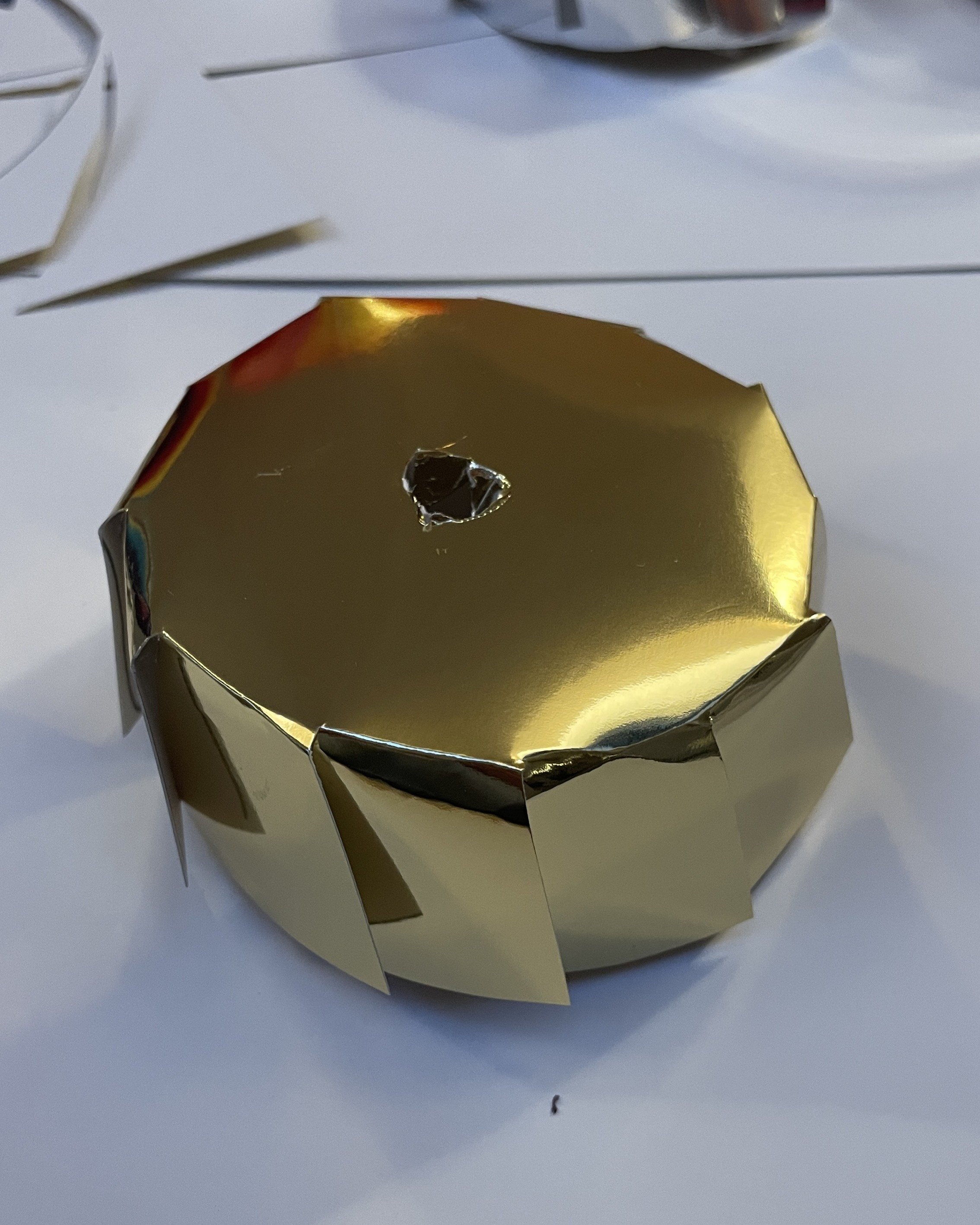 4. Make the top. On metallic card, draw a large circle (approx. 15 cm) and a smaller circle inside it. Cut out the larger circle, then cut slits from the edge to the smaller circle about 1.5–2 cm apart. Fold the flaps inward to form a lid.