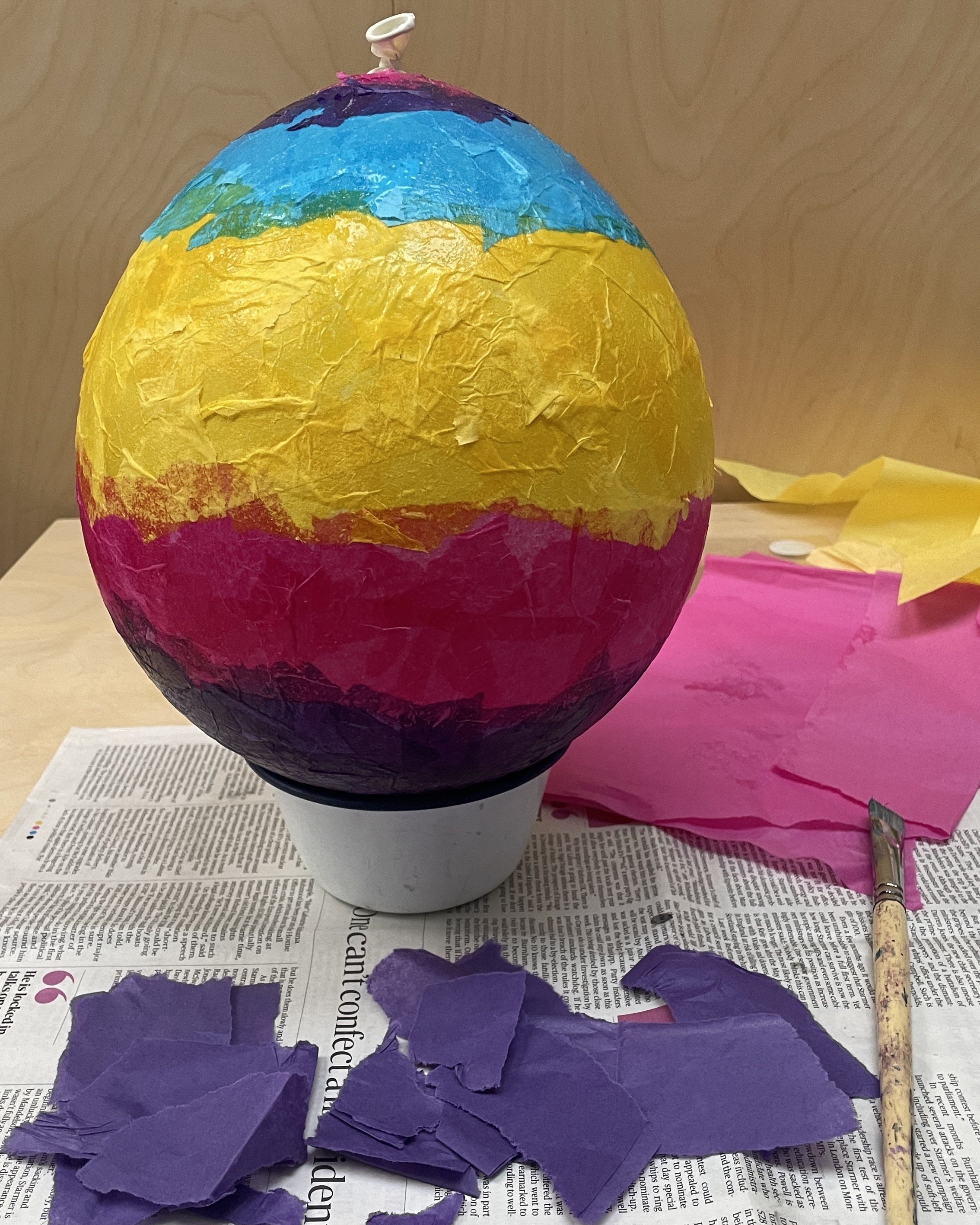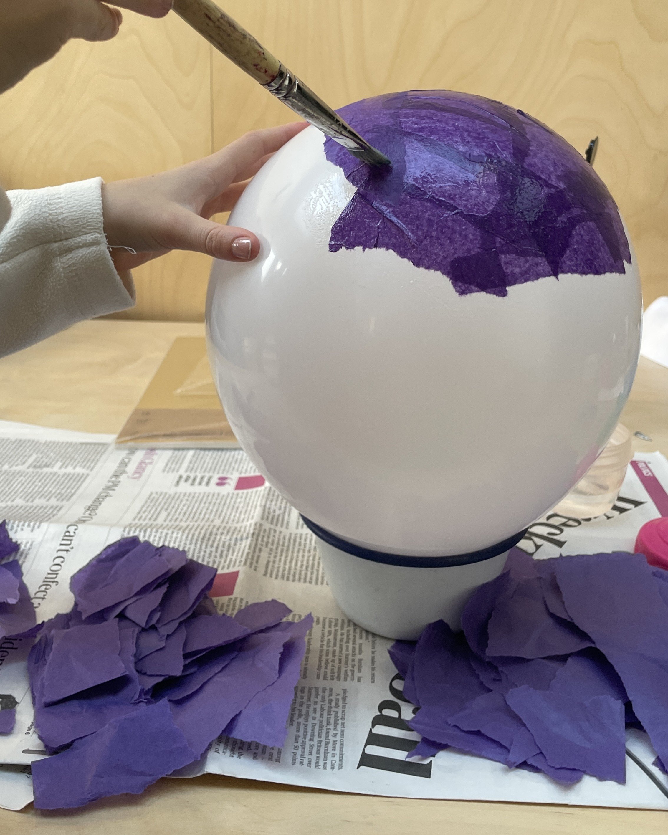 2. Layer with tissue. Tear tissue paper into small pieces (approx. 3 × 2 cm). Using your brush, paste them over the balloon with PVA glue. Cover with 3–4 layers. Leave to dry for 1–2 days.
