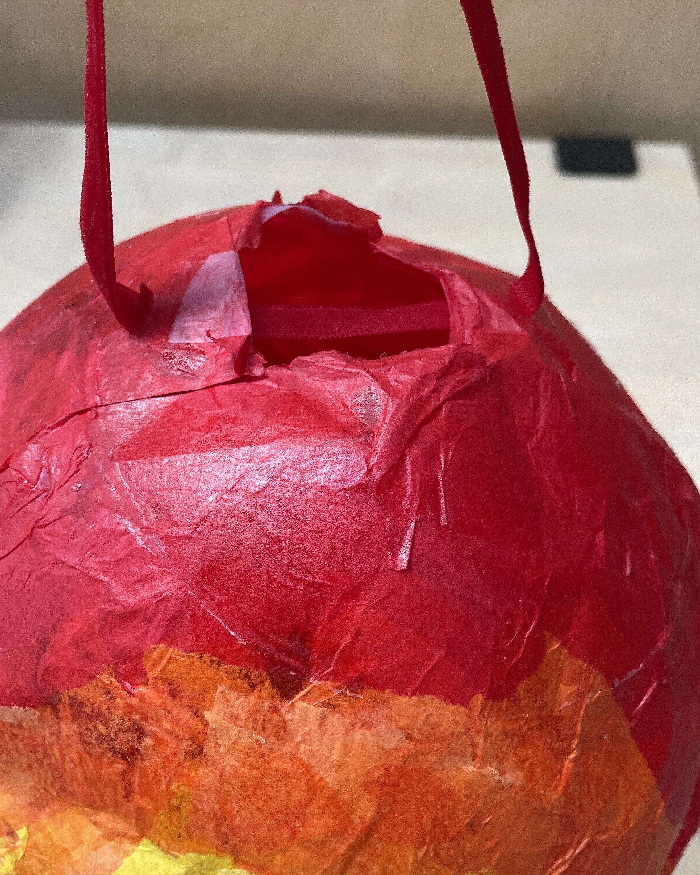 6. Thread and hang. Thread string or ribbon (about 1 m) through the bauble holes, up through the lid, tie at the top, and your giant bauble is ready to hang!