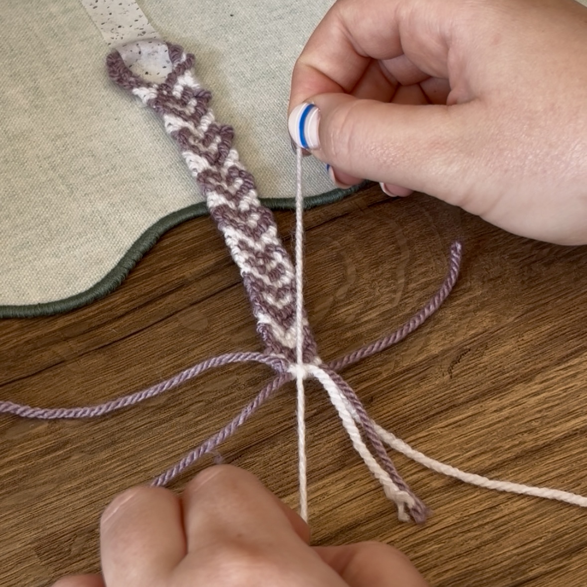 - Take the second inner strand on the left and tie a double backward knot, moving outwards from the centre. Repeat this on the right side using a double forward knot. This creates the edges of the heart shape.