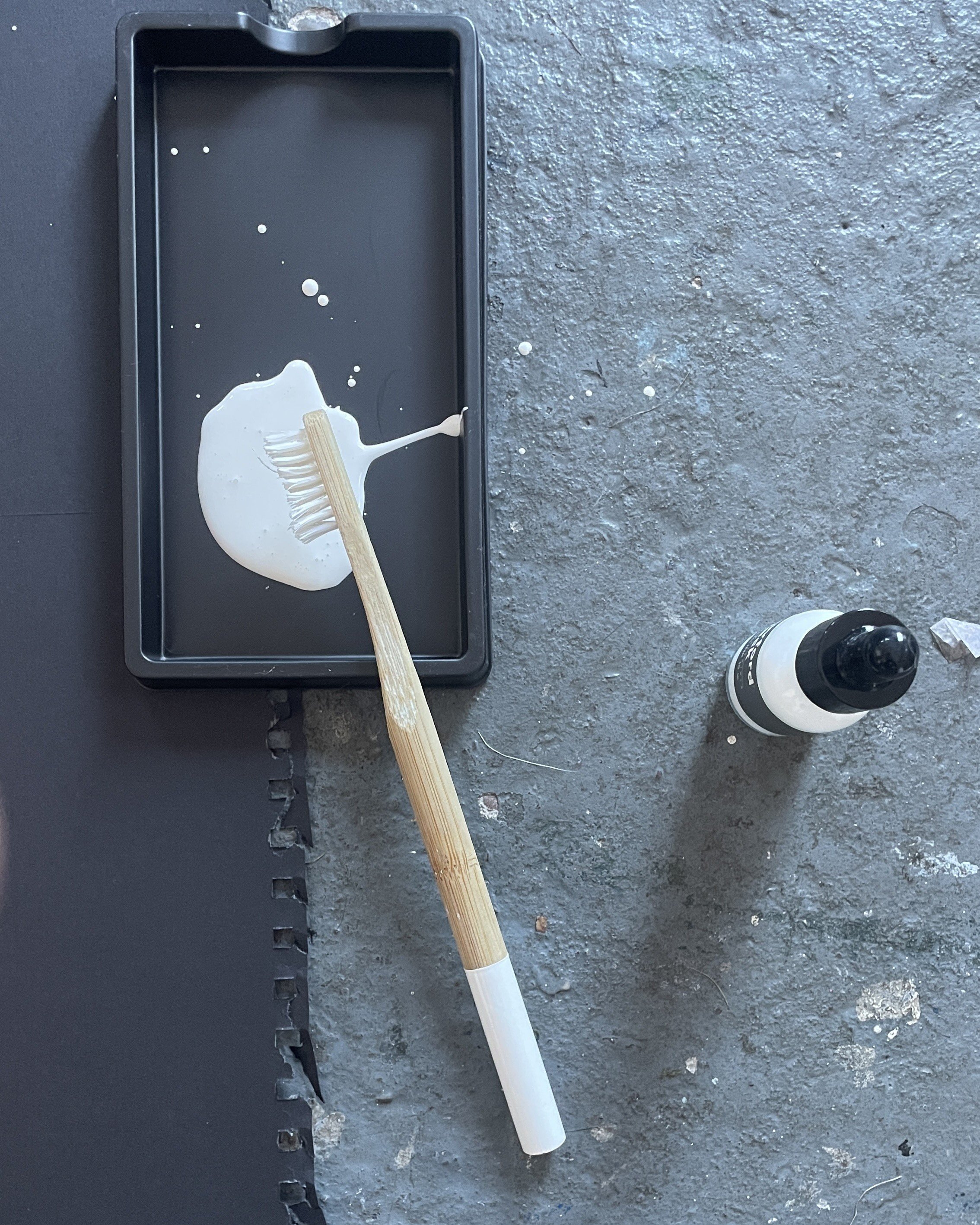3. Splatter the stars. Pour white ink into a bowl or lid. Dip the toothbrush in, then run your finger along the bristles to create a splatter pattern across the paper.