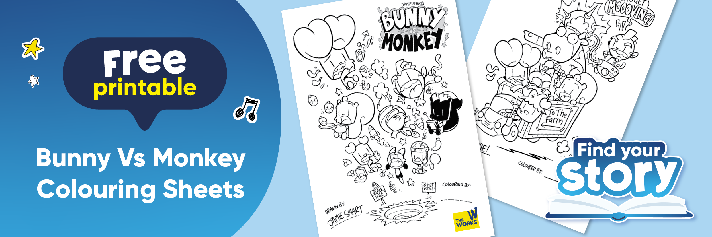 With that said, we’ve got some Bunny Vs Monkey colouring sheets available to download and print right now! These activity sheets are sure to keep your kids entertained whilst introducing them to a world outside of reading