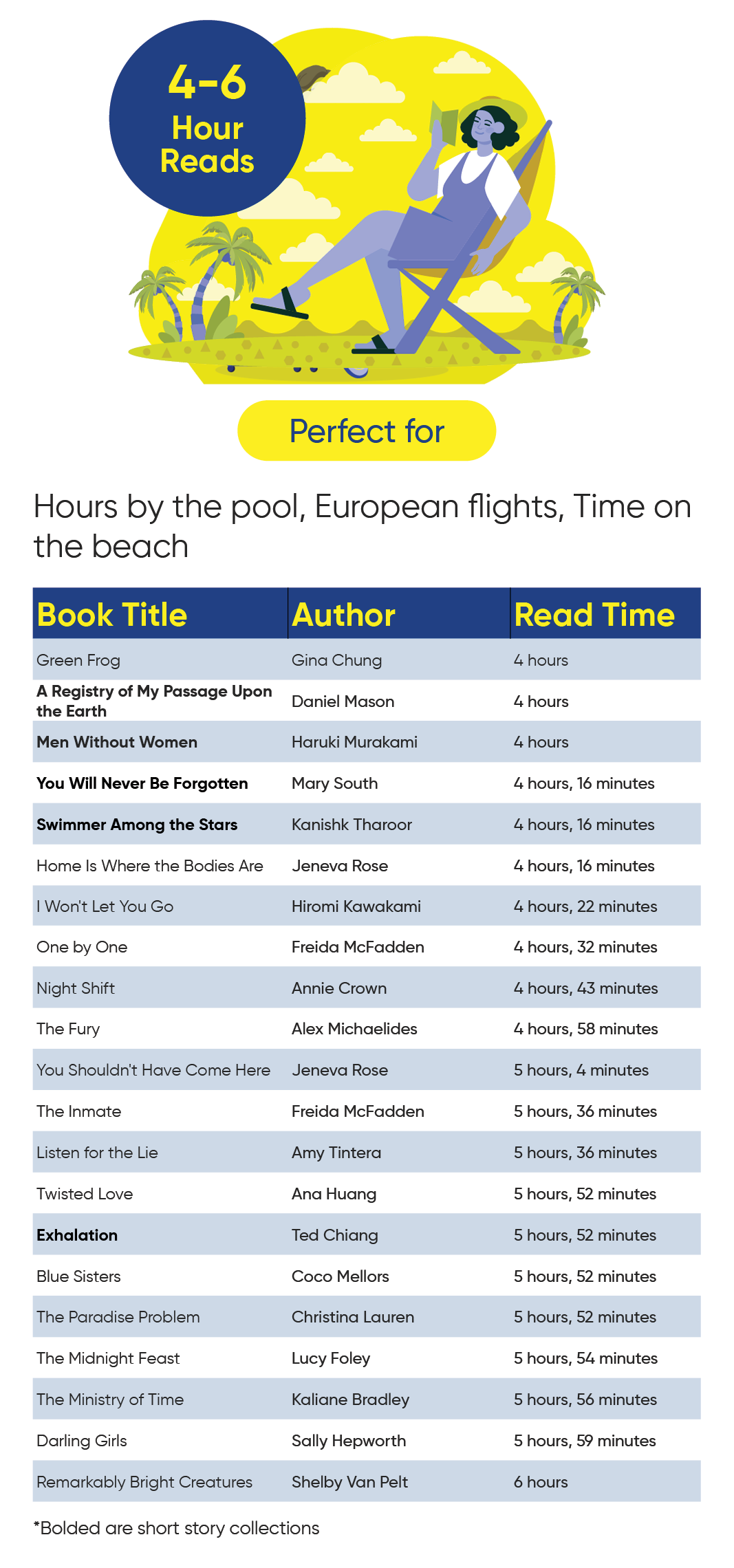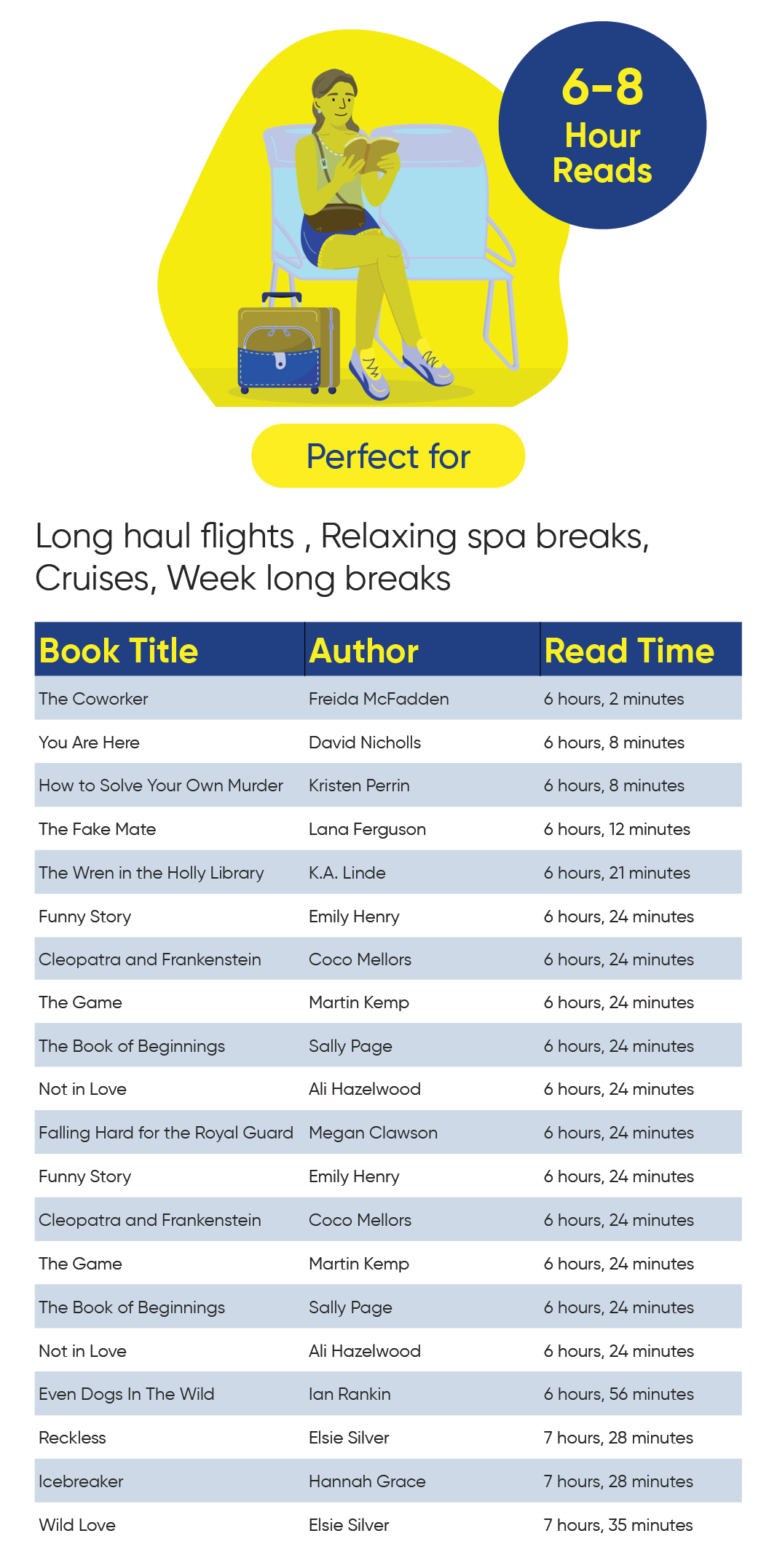 For those looking to pick up their book regularly on holiday, you may be looking for a slightly longer read. The more romantic among us should certainly look to the Elsie Silver collection, with Powerless, Flawless, Reckless and Wild Love all coming in at just under eight hours per read.