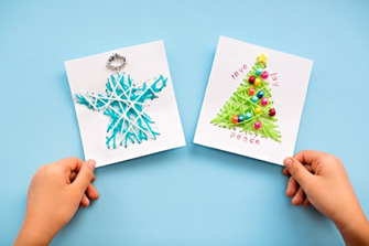 For those who want to do something slightly more challenging with string, then this Christmas card craft is perfect for you. By poking some holes in your card, threading the yarn through it and adding the odd embellishment with a bead – you can make everything from a fully decorated tree to an angel.