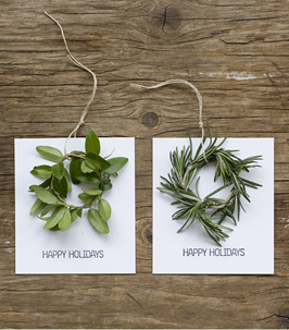 This is a super-simple but highly effective idea using small pieces of greenery such as mistletoe, rosemary or anything that you think would work well as a miniature wreath. Once you’ve created the mini-wreath, tie them to some white card to let the greens take centre stage.