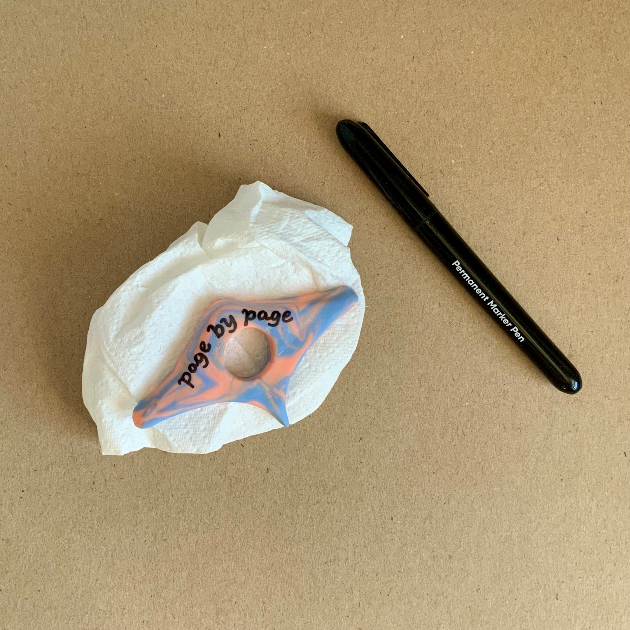 Use a black permanent marker pen to write ‘page by page’ — or your own choice of words — on the top surface. Rest the book page holder onto a scrunched up piece of paper towel to make it easier to write onto. These could also be personalised with handwritten names.