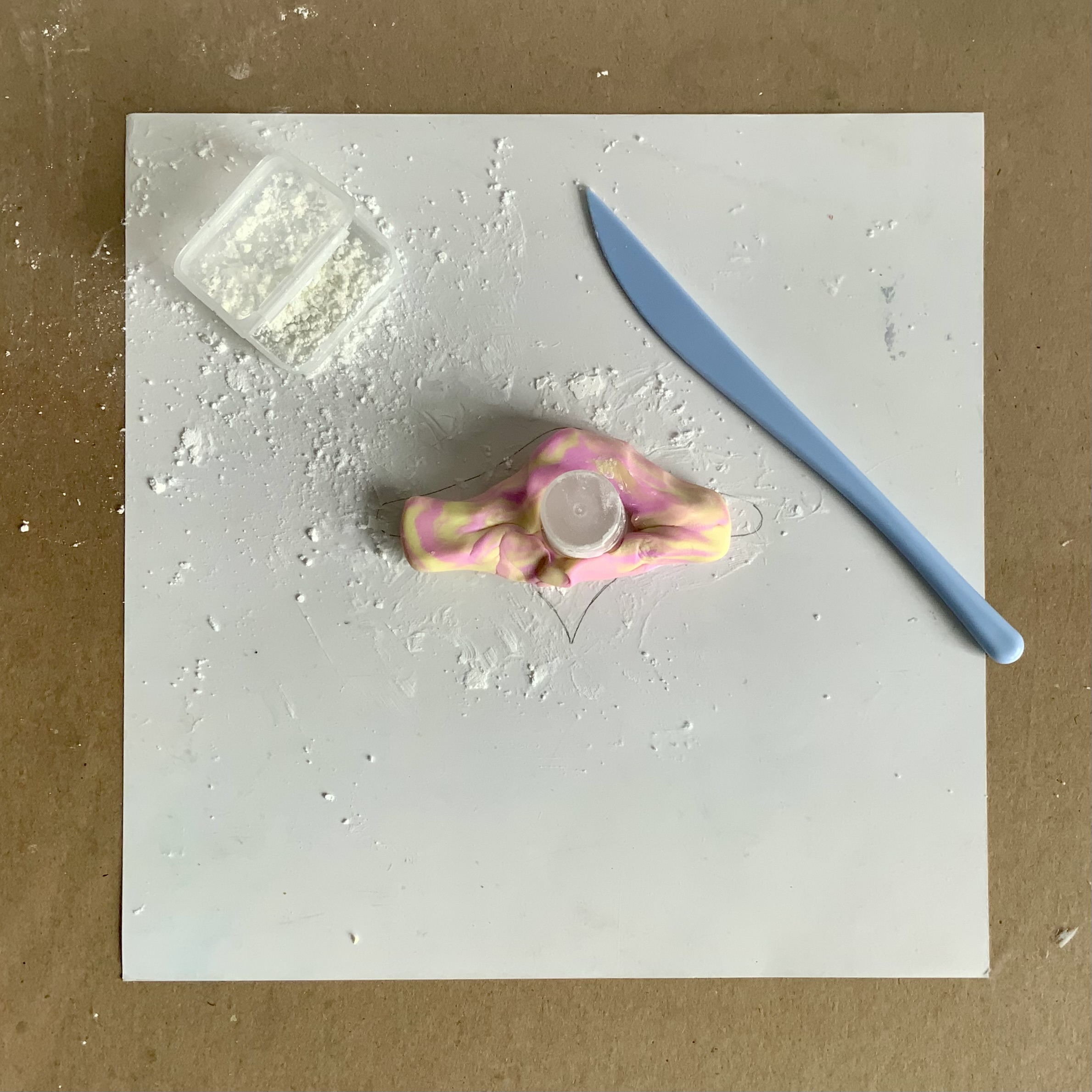 Cover the lid with corn flour and place this down in position. Wrap the marbled clay around the lid and begin shaping it to fit the template using your fingers and the tools.