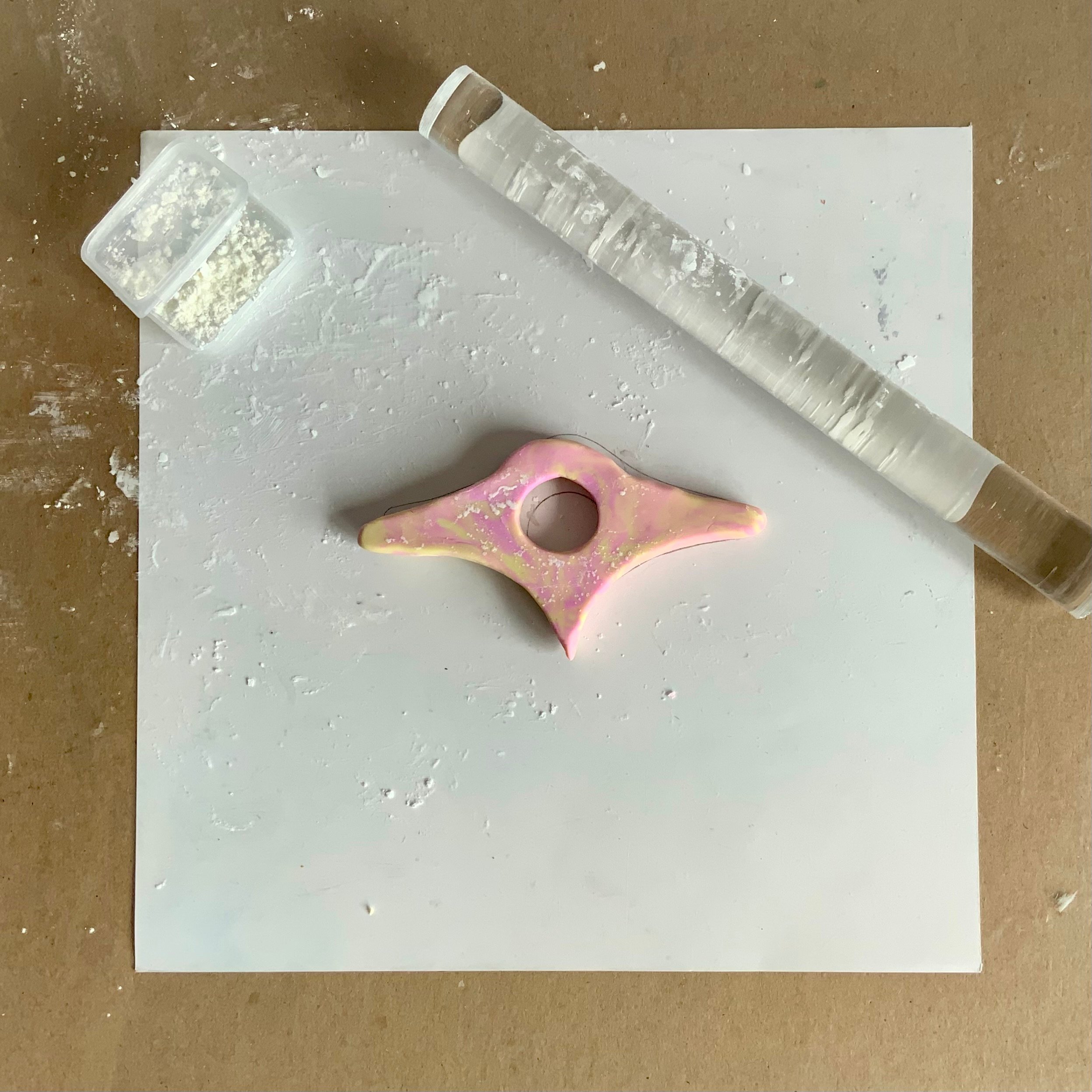 Cover the drawn template with a sheet of acetate and sprinkle a little corn flour over the surface. This prevents the clay from sticking to the acetate.