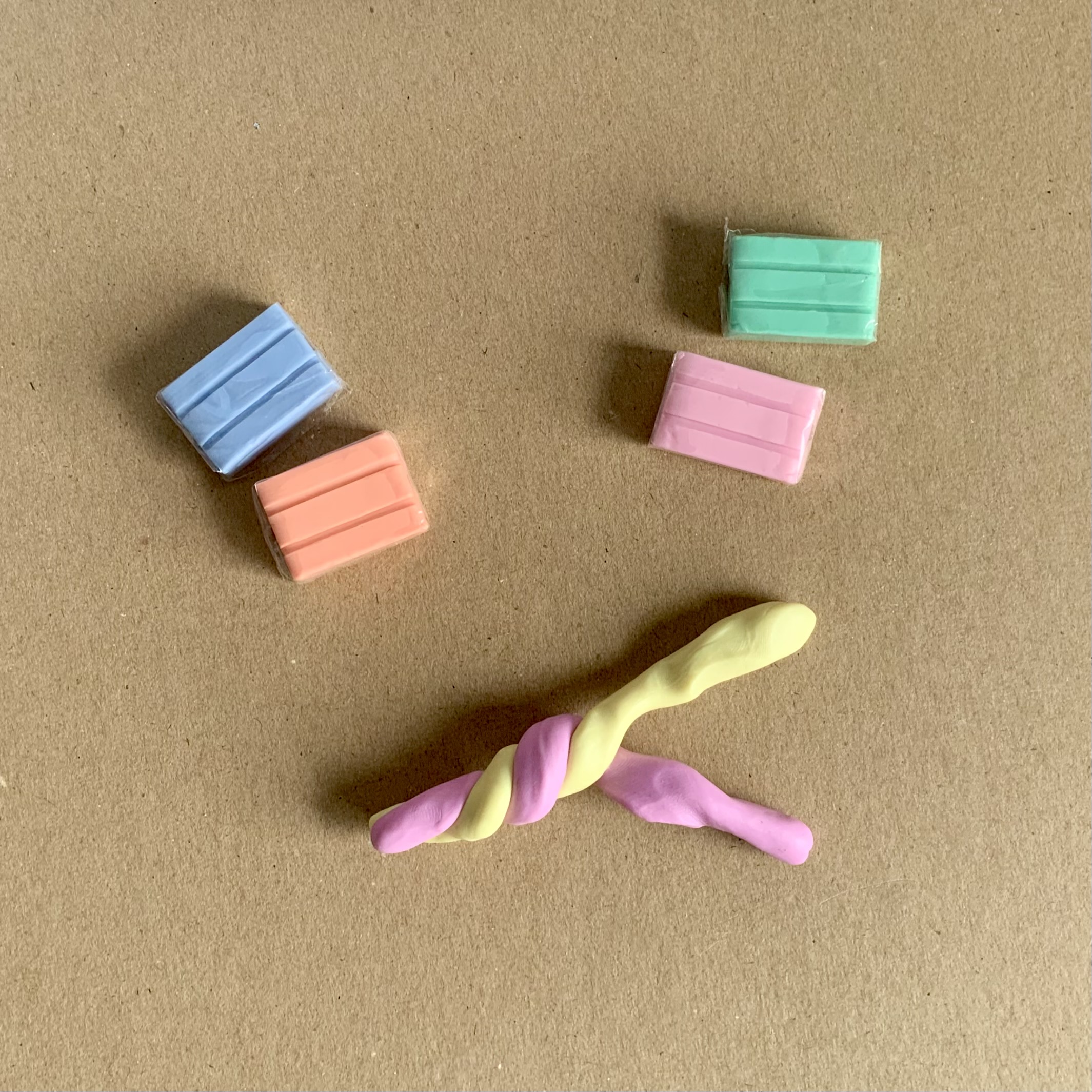2. Unwrap a set of two clay blocks. Knead each block separately in your hands to warm and soften the clay. Create a sausage with each colour. Twist the two sausages together to begin mixing them into one marbled piece. Fold the twisted sausage in half and twist this together. Repeat a couple more times until the clay is rippled with the two colours.