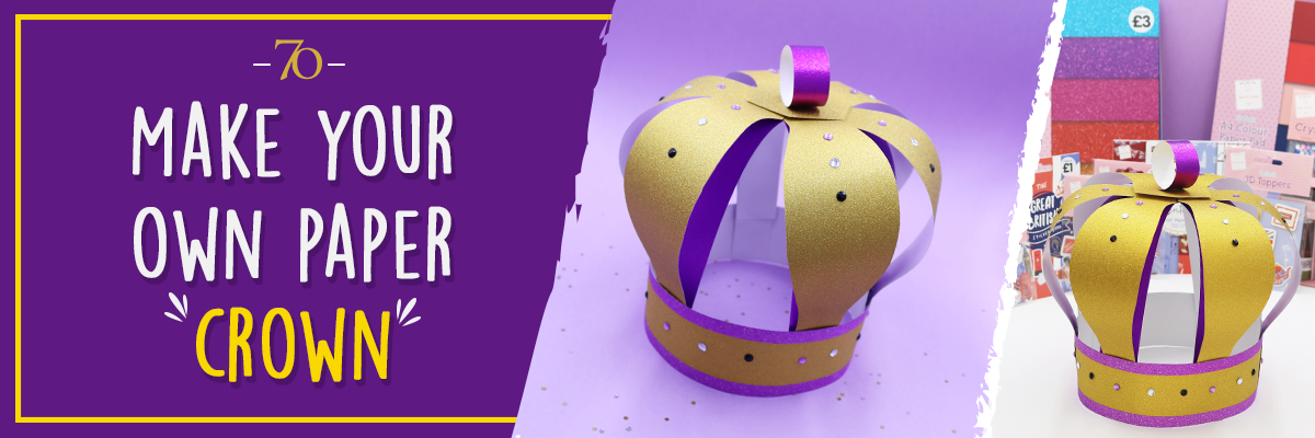 1. Select your coloured paper from one of our A4 paper pads (we opted for glitter paper) you will also need a pair of scissors and glue dots to make the crown