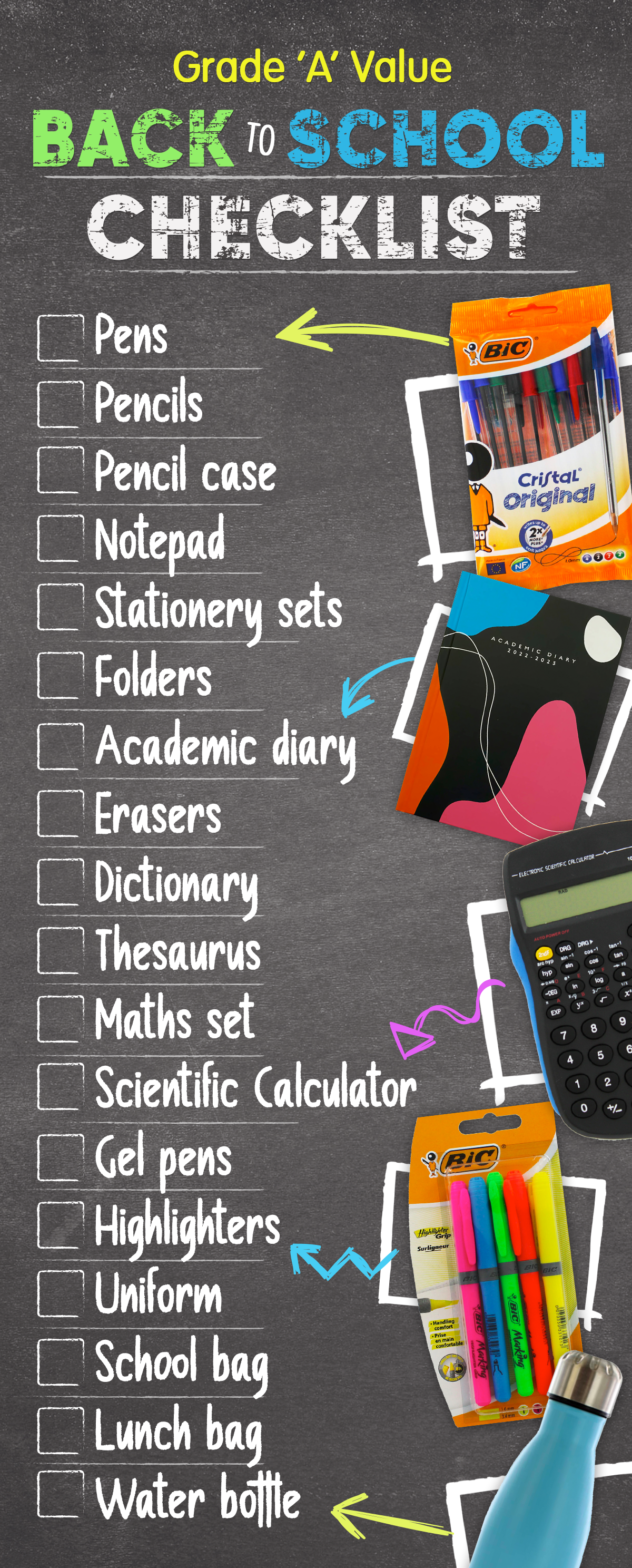 - - Pens: It’s an obvious one, but it wouldn’t be a complete back to school checklist if we didn’t include them, would it? And - trust us, you can NEVER have too many! Have a look at our range of pens for everything from ballpoint to gel!
